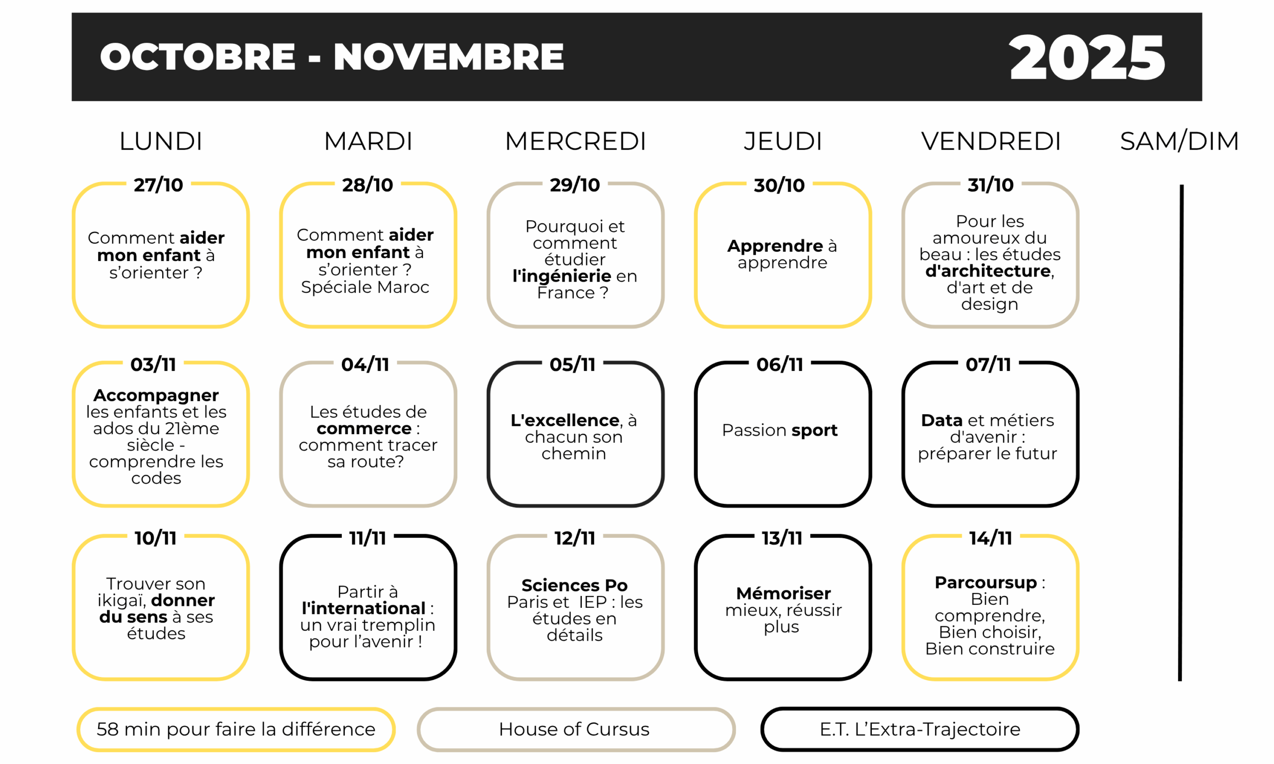 Pendant 15 soirs, du 27 octobre au 14 novembre 2025, assistez gratuitement à une série de conférences inédites autour d’un enjeu majeur : l’orientation des jeunes. Pour cet événement exceptionnel, Eurêka Study réunit des professionnels de leur secteur et des témoins inspirants pour explorer trois grandes thématiques.